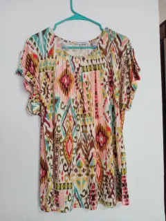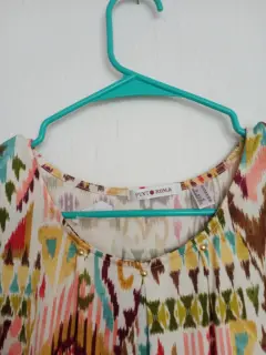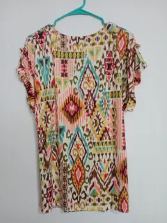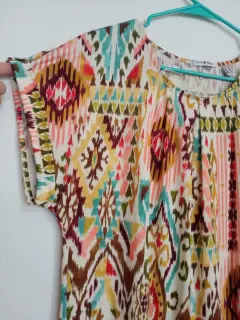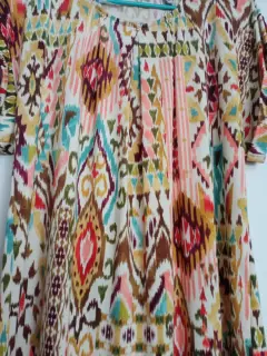Hermosa blusa marca punto Roma. Talla M. Poco uso. Muy buen estado. Colores ocres. Con símbolos como geométricos rombos. Linda caída de la tela. Mide ancho 42 CM. No tiene marcado hombros. Largo 66 CM. Y de sisa 55cm. Viene muy amplia. Lindas mangas cortas unidas con una cintilla. Cuello redondo que adornan 3 botones dorados redondo. Es de vestir lavado en casa. La tela es algo elástica. Muy linda