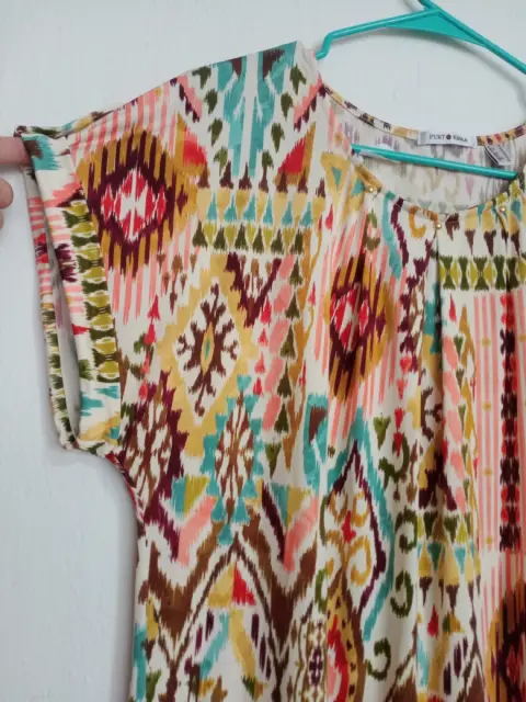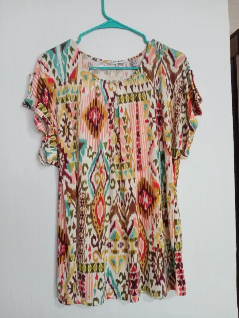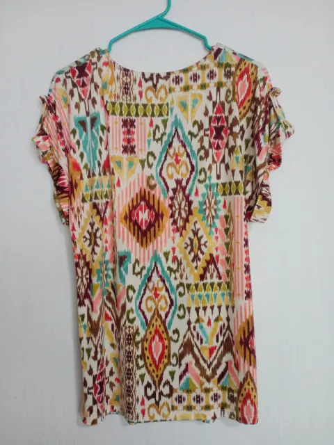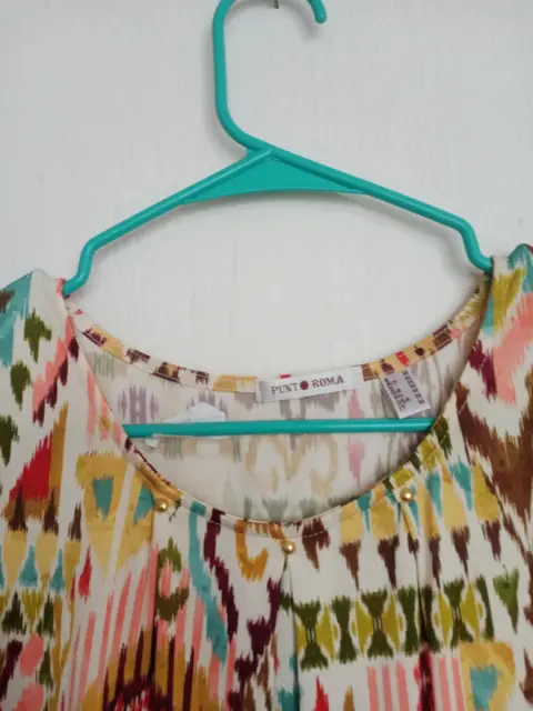 Blusa punto Roma talla M. dibujos geométricos. Hermosa blusa marca punto Roma. Talla M. Poco uso. Muy buen estado. Colores ocres. Con símbolos como geométricos rombos. Linda caída de la tela. Mide ancho 42 CM. No tiene marcado hombros. Largo 66 CM. Y de sisa 55cm. Viene muy amplia. Lindas mangas cortas unidas con una cintilla. Cuello redondo que adornan 3 botones dorados redondo. Es de vestir lavado en casa. La tela es algo elástica. Muy linda