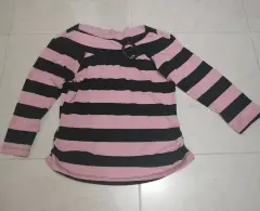Blusa rayada. Blusa de algodón y lycra negro con rayas en rosa y negro, con altura a la cintura, manga 3/4 y un pequeño accesorio de color negro en la parte de arriba