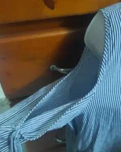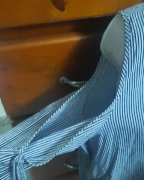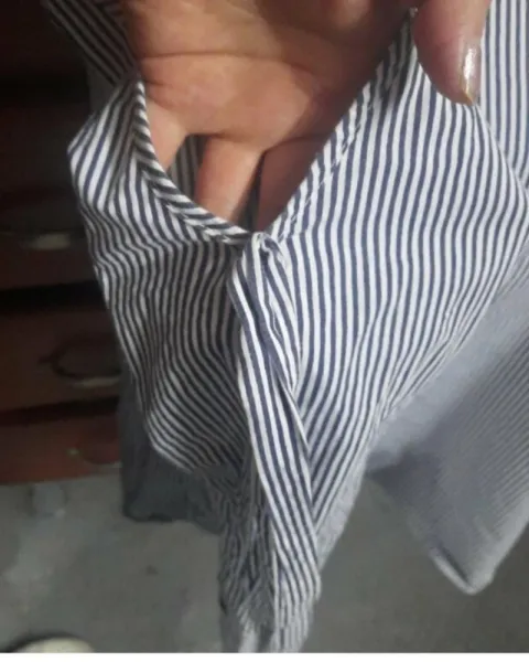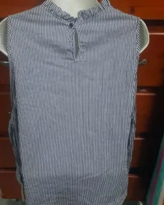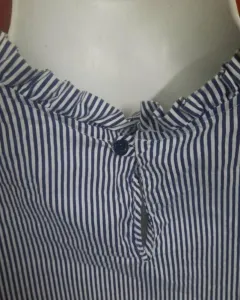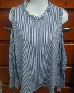 Blusa rayada con cuello ligeramente alto con olan, cuenta con botón trasero para ajustar,mangas largas abiertas al hombro y con detalle de cordón