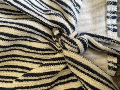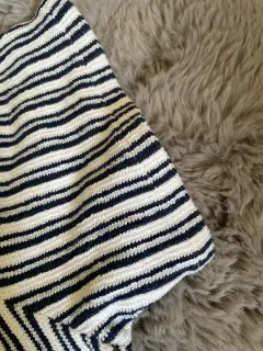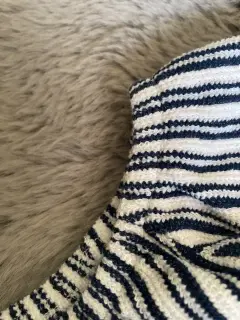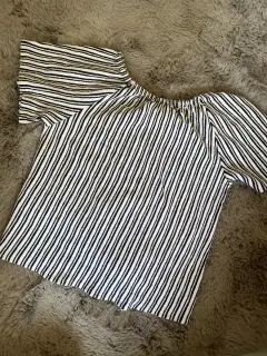 Blusa a rayas azul y blanco, cinta para amarrar en la cintura, cuello con resorte