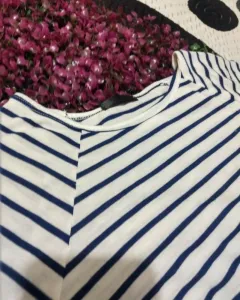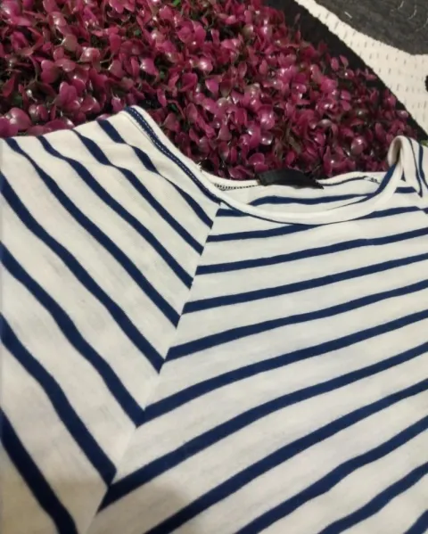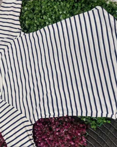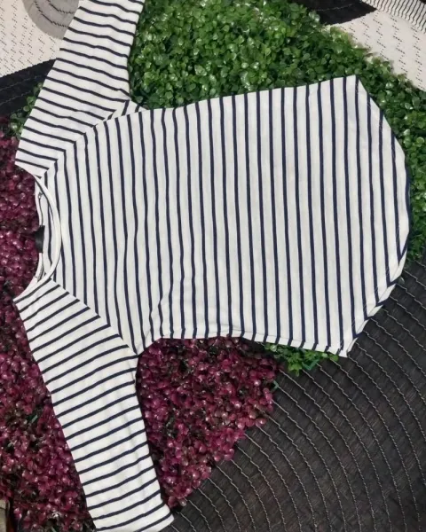 Blusa con corte redondo Manga tres cuartos Color: blanco Rayas azul marino Cuello redondo Talla: XS queda a S 💖Todas los paquetes se envían con regalo incluido ✨Para más información contáctame sin compromiso 😃