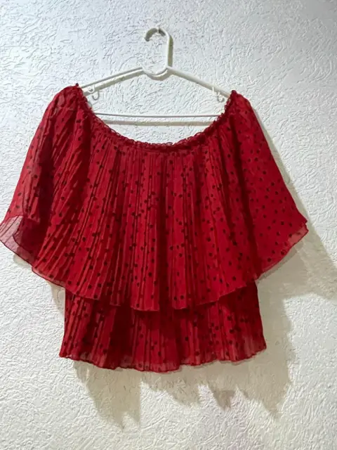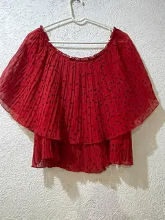 Blusa color rojo y detalles de lunares en negro, con escote a los hombros