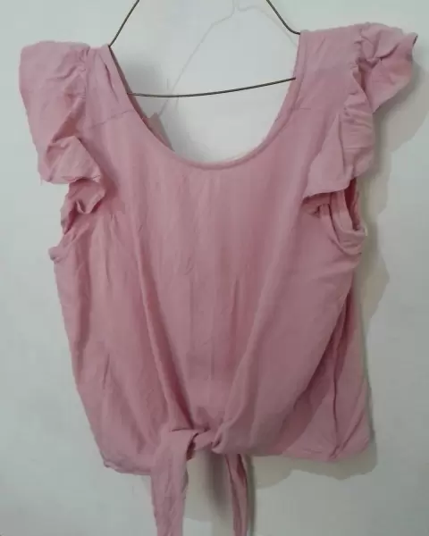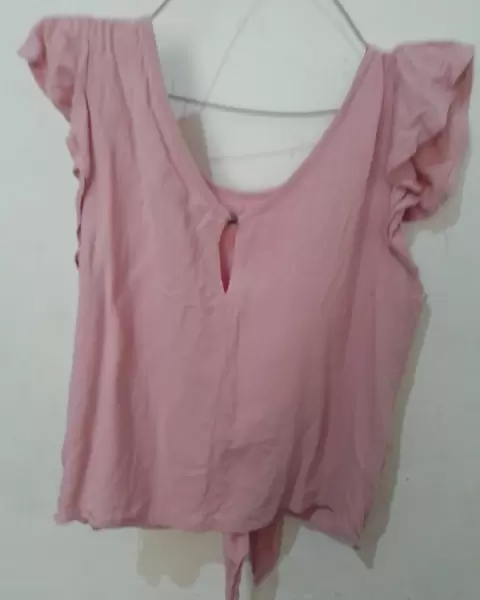 Blusa rosa. Blusa rosa, con olanes en las mangas, cinta para ajustar al frente y botón en la parte superior de atrás