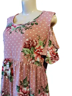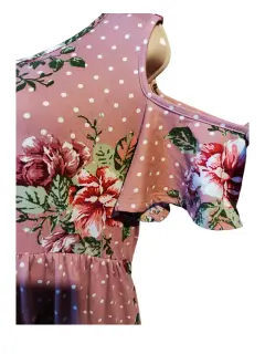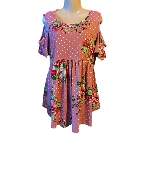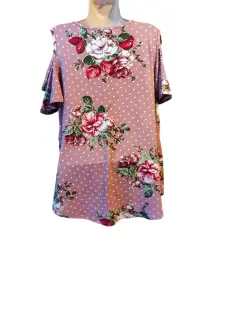 Linda blusa color rosa con flores y bolitas blancas está en perfecto estado estira tiene escote en hombro no tiene ningún detalle