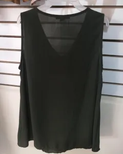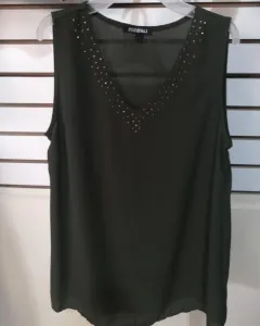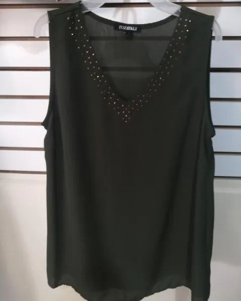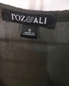 Blusa roz&ali. Blusa de vestir de manga corta, con brillos en la parte del cuello, forma V, color verde militar, talla S, incluye fondo