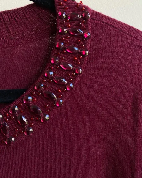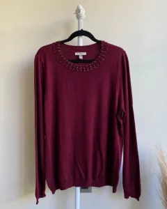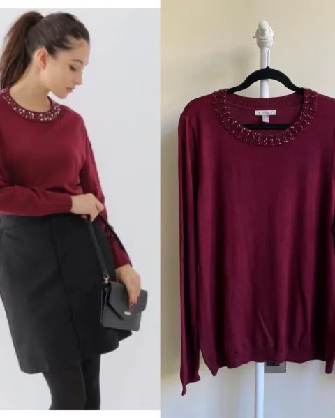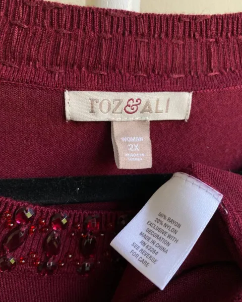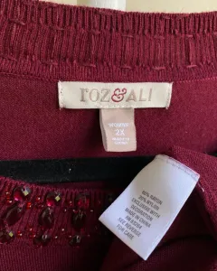Blusa Roz&Ali.Talla 2XL, color vino.Collar bordado con joyas y chaquira, tejido ligero stretch.Medidas en cm: hombros 40, axilas 57, manga 69, largo 69, ancho bajo 49.La tela es stretch.