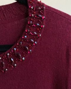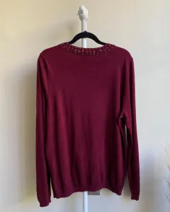 Blusa Roz&Ali joyas. Blusa Roz&Ali.Talla 2XL, color vino.Collar bordado con joyas y chaquira, tejido ligero stretch.Medidas en cm: hombros 40, axilas 57, manga 69, largo 69, ancho bajo 49.La tela es stretch.