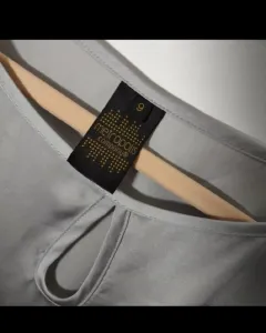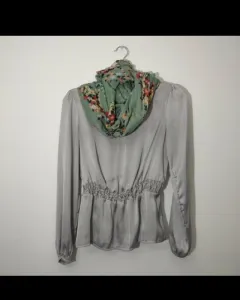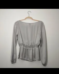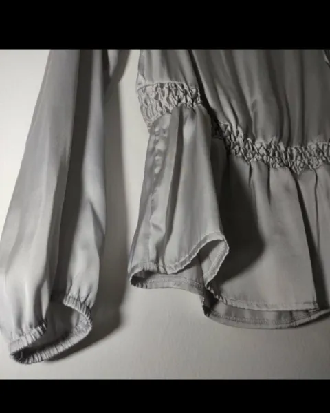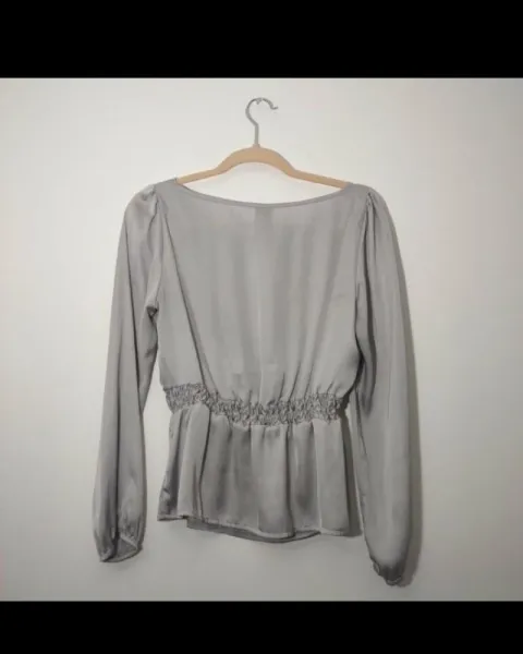 Blusa satin gris. Glam!Blusa satinada gris plata con cintura alta ceñida con pretina decorada y mangas ceñidas bombachas, así como los hombros.T: MMedidas Axila 47cmLargo 56cm