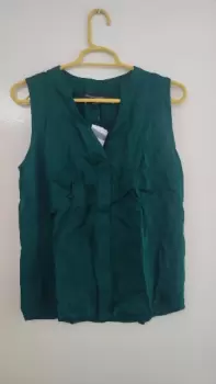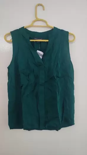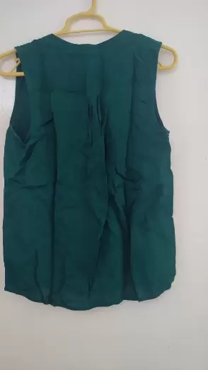 El color es hermoso 🫶Blusa sin mangas, tela satinada. Color verde botella.Tiene una mancha de desodorante que se le quedo cuando alguien se la probó.