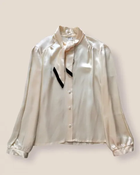 Blusa satinada aperlada. Súper súper padre blusita en tono perla, satinada suave al tacto y con corbatín con detalles en terciopelo.