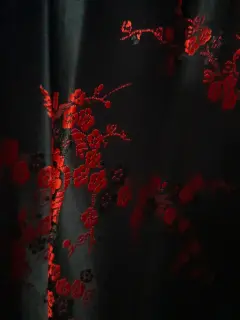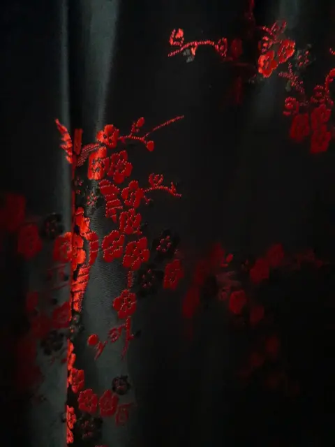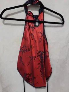 Blusa de seda súper sexi negra con flores bordadas rojas, se ata al cuello con velcro , espalda descubierta solo se ata con cintas.