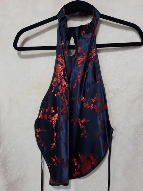 Blusa sexy de seda. Blusa de seda súper sexi negra con flores bordadas rojas, se ata al cuello con velcro , espalda descubierta solo se ata con cintas.