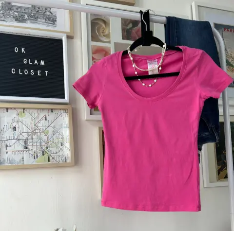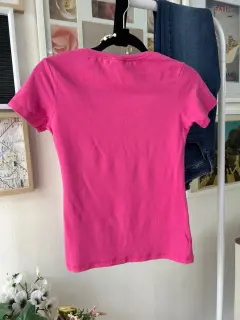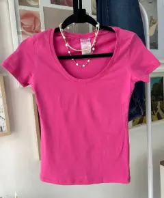 Blusa Sexy JNS. Hermosa blusa color rosa, tela strech, escote redondo, manga corta, queda ajustada, talla Ch