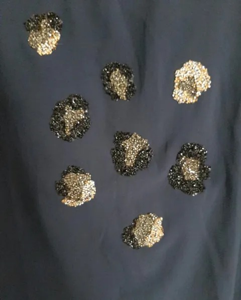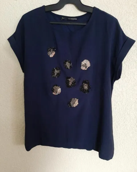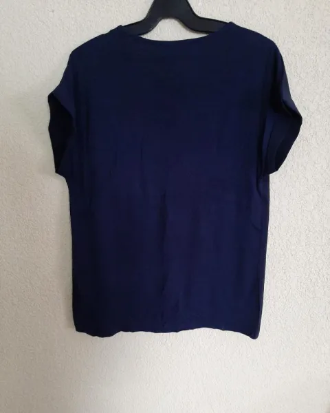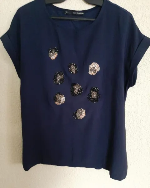 Bonita blusa azul marina, con dos tipos de tela y detalles de piedritas al frente. Tela muy fresca. En buen estado, sin detalle.