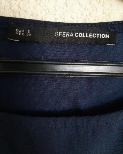 Blusa Sfera con detalle de piedritas. Bonita blusa azul marina, con dos tipos de tela y detalles de piedritas al frente. Tela muy fresca. En buen estado, sin detalle.