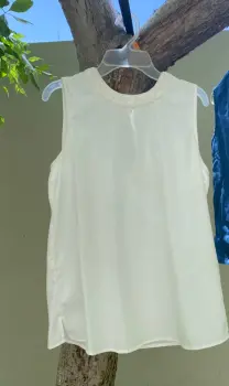 Linda blusa sin mangas, blanco aperlado con cuello redondo plisado y botón atrás