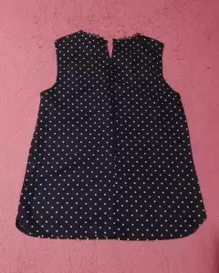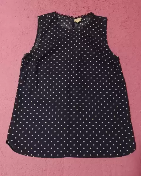 Blusa sin manga, tela fresca, con encaje en la orilla del cuello, boton en la parte de atrás del cuello, color azul marino con puntos blancos.