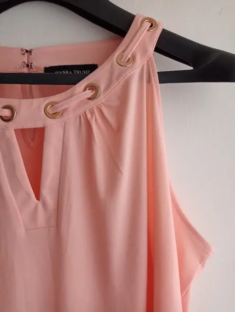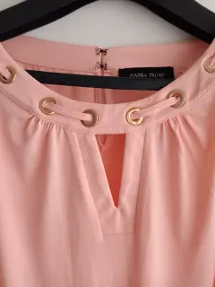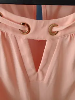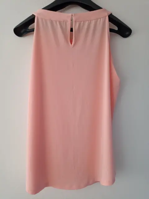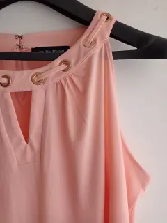 Blusa sin mangas con cuello redondeado y escote con agujero en la llave, con detalles dorados en cuello. Medidas: busto 55.5 cm; largo 68.5