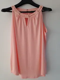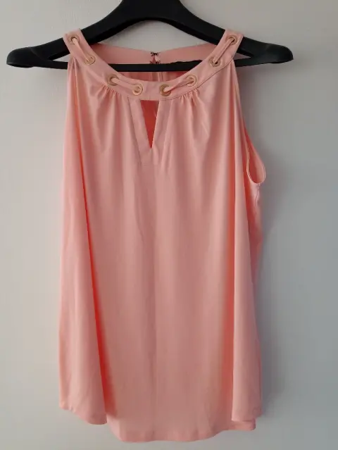 Blusa sin mangas. Blusa sin mangas con cuello redondeado y escote con agujero en la llave, con detalles dorados en cuello. Medidas: busto 55.5 cm; largo 68.5