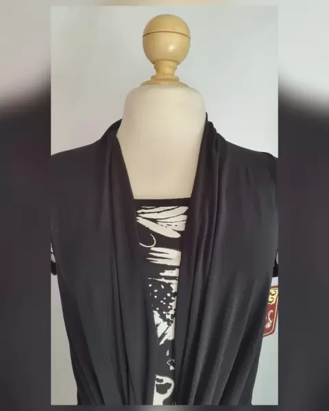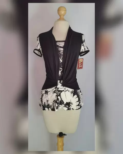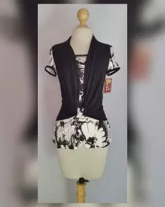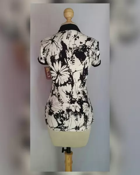Blusa stretch estampado floral bitono NEGRO ÉBANO/BLANCO LINO, cuello cuadrado, frente drapeado, elástico en laterales p/mejor ajuste y manga corta. Talla 32. Dimensiones cms: 39 hombro, 46 axila, 38 cintura, 53 zona baja, 67 largo, 15 largo manga. 95% poliéster, 5% spandex. Para lavado en casa.