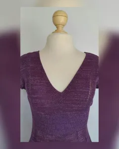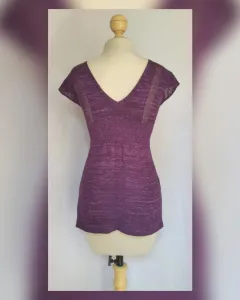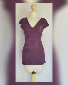 Blusa en tejido de punto color PURPURA c/hilo metalizado, cuello pico y manga sisa. Talla G (REDUCIDA, da mejor a M). Dimensiones cms: 45 hombro, 35 axila, 31 cintura, 52 zona baja, 70 largo. 78% acrílico, 18% fibra metalizada, 8% elastano. Para lavado en casa.***POR LA COMPOSICIÓN DE LA PRENDA, DA DE SI APROX 10 CMS***