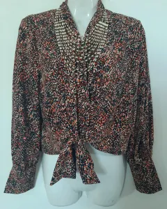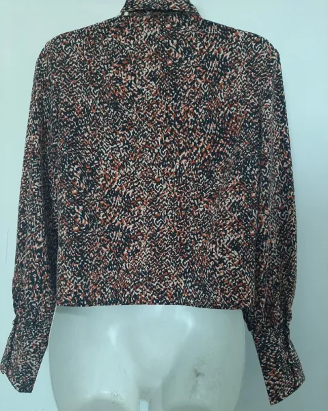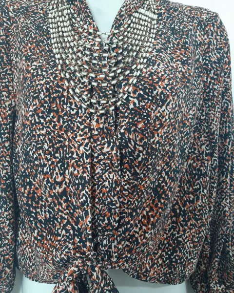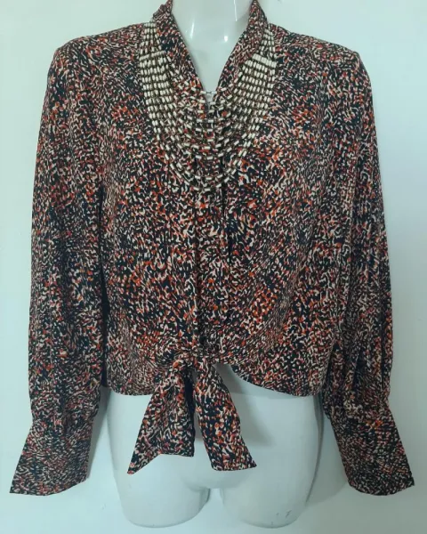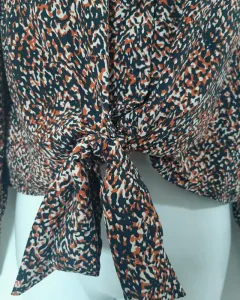 Blusa manga laga , cuello en V, con botones en la parte de enfrente y se amolda al cuerpo haciendo un nudo o moño a la altura de la cintura.