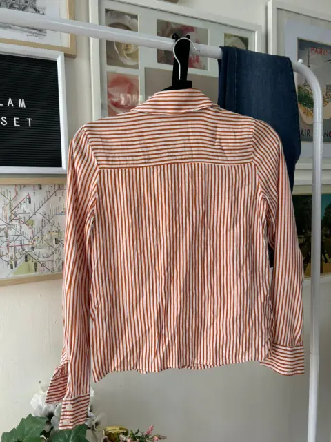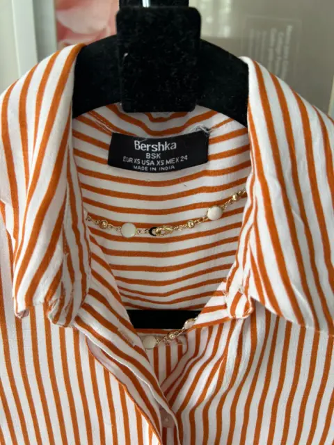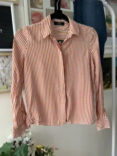 Blusa Bershka tipo camisa, talla S, a rayas en colores blanco y terracota, manga larga