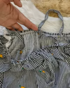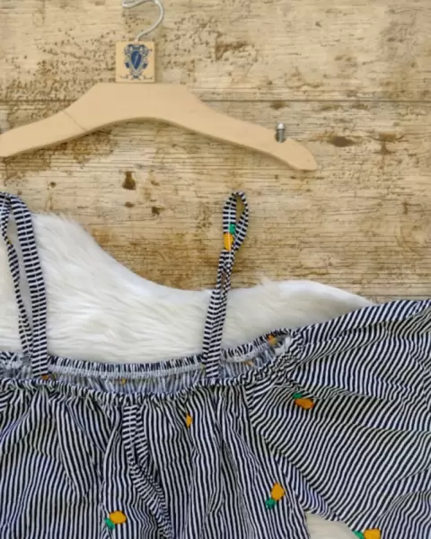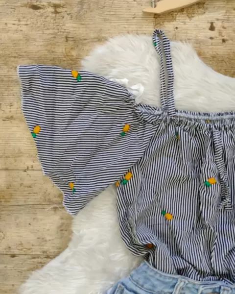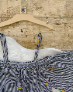 Hermosa blusa tipo campesina con tirantesTiene un estampado increible de piñasLa tela es sencilla y delgadaQueda a talla XS y SSin detallesCompletamente nueva con etiqueta
