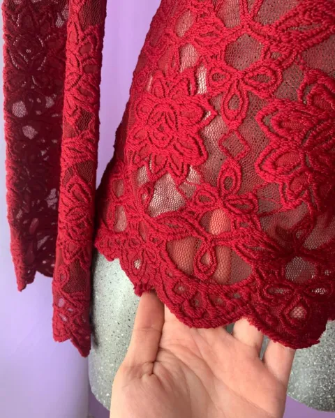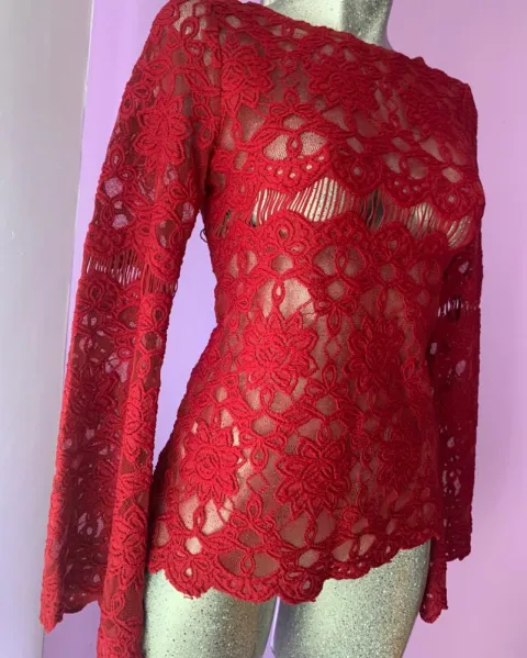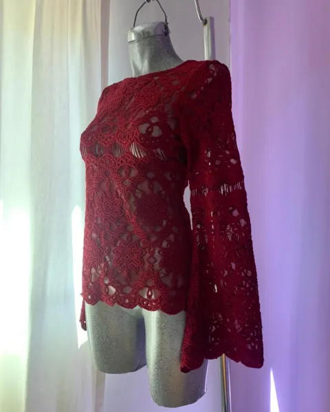 Hermosa blusa tipo crochet, color vino, en manga larga y acampanada. Cuello redondo, talla chica.Sus medidas son: 58cm de largo, 45cm de axila a axila y 63cm de manga.