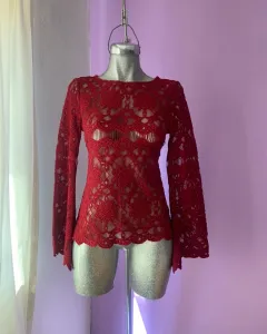 Blusa tipo crochet manga acampanada. Hermosa blusa tipo crochet, color vino, en manga larga y acampanada. Cuello redondo, talla chica.Sus medidas son: 58cm de largo, 45cm de axila a axila y 63cm de manga.