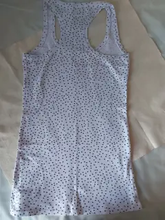 Blusa sin mangas tipo deportiva color blanca con lunares en color azul, elástica, nueva.