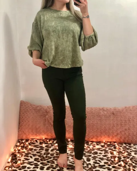 Blusa tipo oversize. Es un suéter / blusa, con manga 3/4 el estilo es oversize, flojito y su diseño es tipo deslavado.