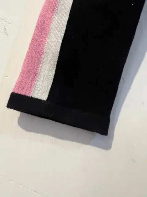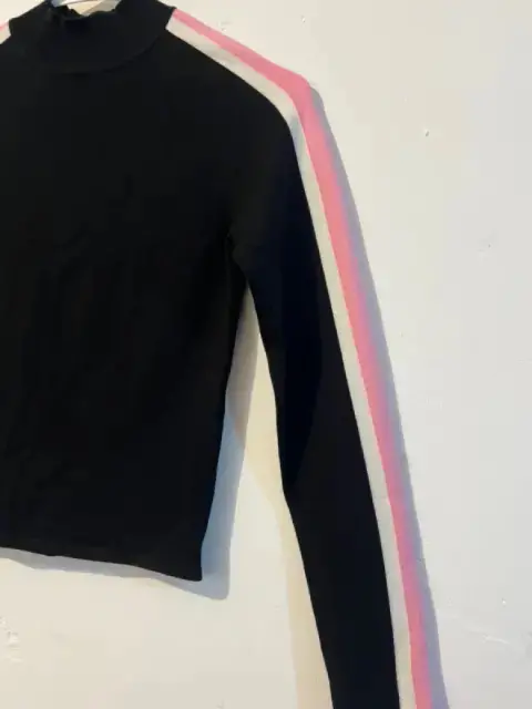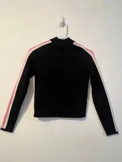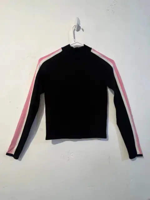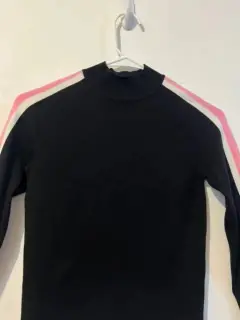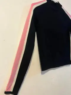 Bonita blusa tipo suéter , delgado con rayas en color negro , rayas en los hombros, color blanco con rosa .Talla: XS Tela strech .