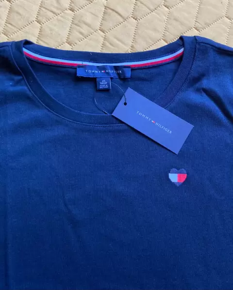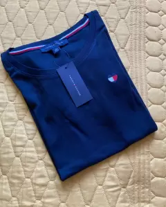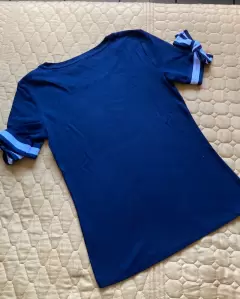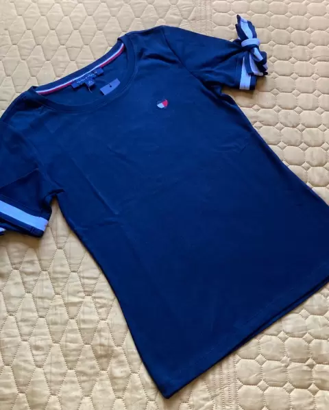 Blusa tommy moderna. Blusa tommy azul marino cuello redondo con manga corta y moños en sus orillas en talla XS