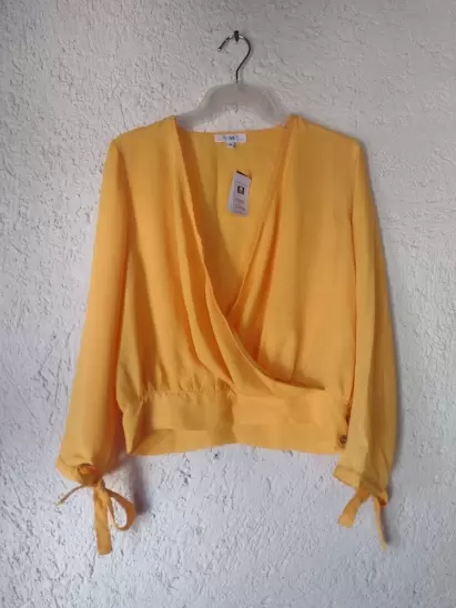 Blusa tipo gasa, con cuello en V diene detalles de botones dorados en las mangas de ¾. Luce increíble.