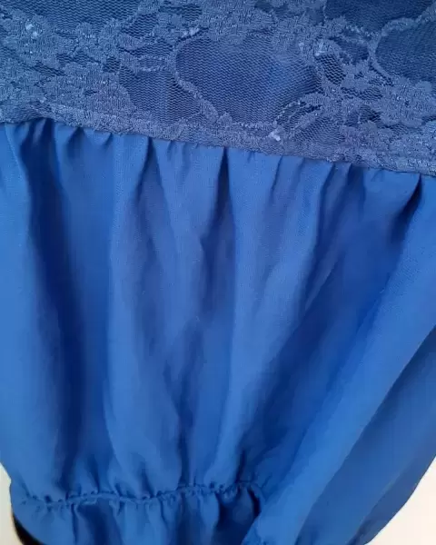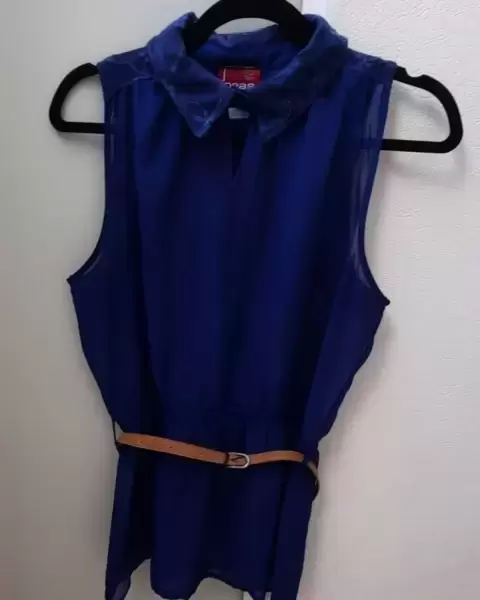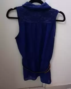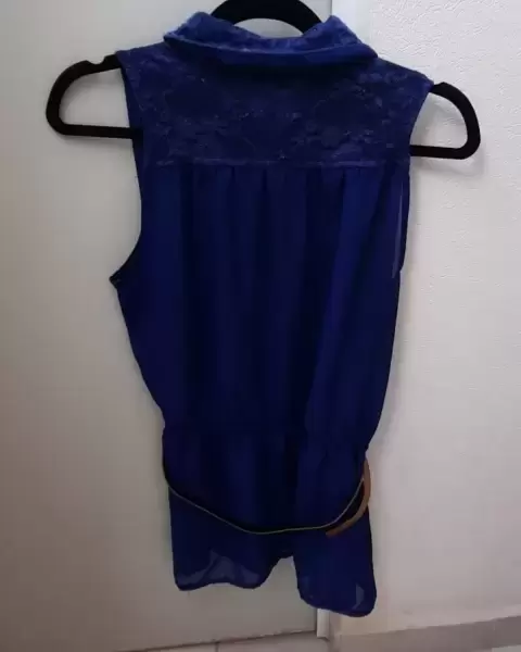 Blusa transparente color azul rey con encaje en el cuello al igual que puedes ajustar con boton cuenta con resorte para acentuar la cintura y cinturon.