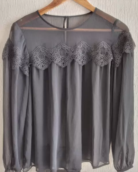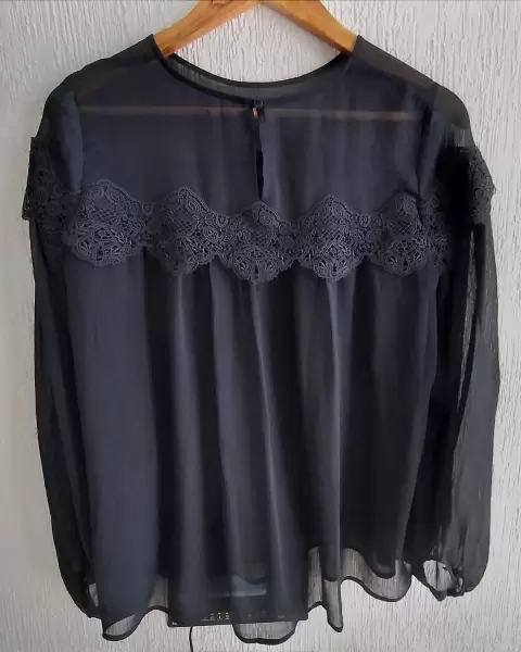 Blusa azul marino transparente con hermoso detalle de encaje en toda la parte superior, dice talla extra chica pero viene amplio.