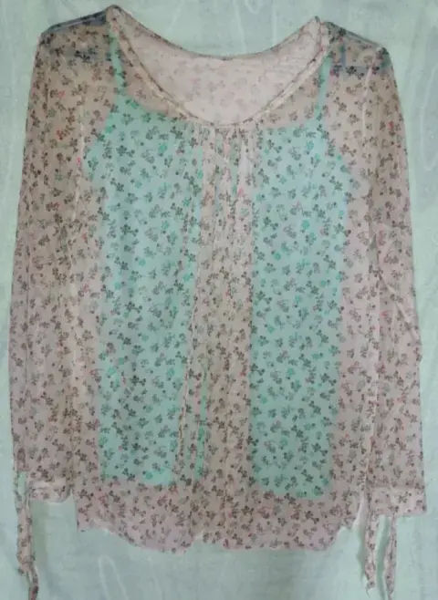 Blusa transparente con top cuello redondo. Linda blusa transparente de flores con top azul verde de abajo.Apto para XS, S, M