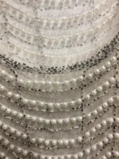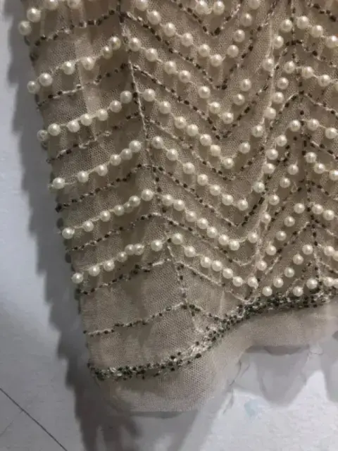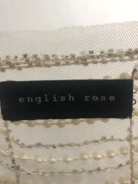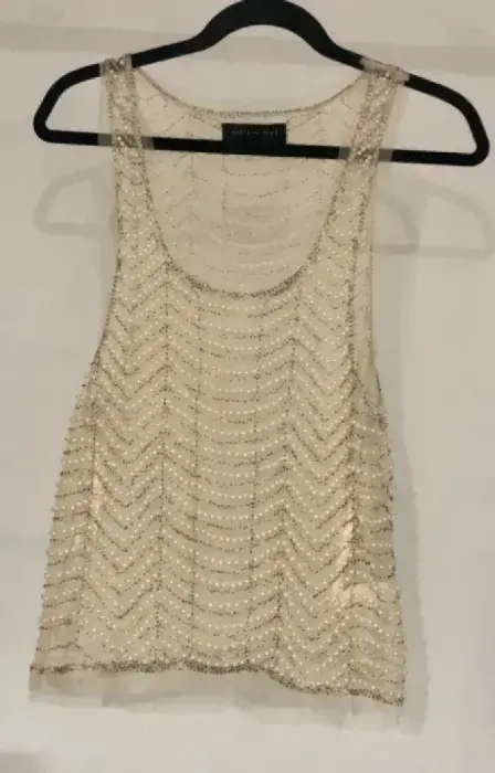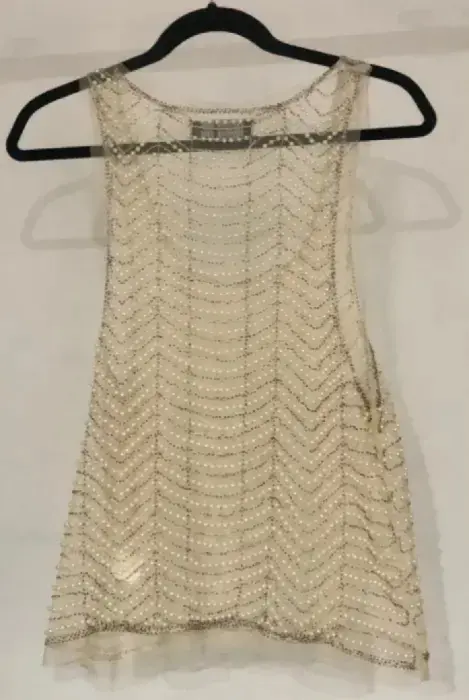 Blusa transparente con pedrería de imitación Marca English RoseTalla chica Color beigeMaterial malla con perlitas de imitación Tiene un detalle un la parte de enfrente lado inferior se le cayeron unas perlitas, adjunto la imagen