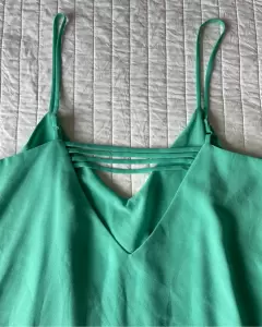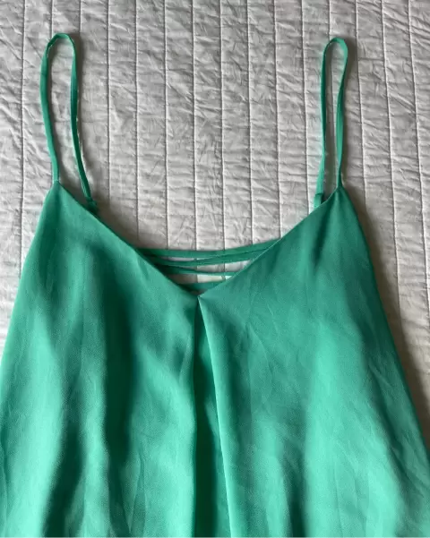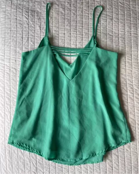 Blusa holgada con forro de tirantes y escote en la espalda con tirantes y tiras como adorno.Tirantes ajustables.Talla: S Medidas: 41 cm de axila y 57 cm de largo desde el tirante, está medida puede cambiar debido a que los tirantes son ajustables.