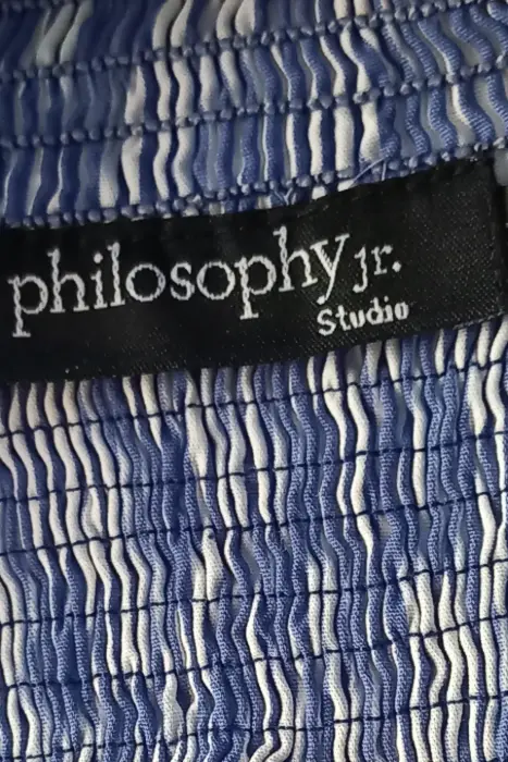 Blusa con hombros descubiertos, manga 3/4 y en tonos lineales blanco con azul.