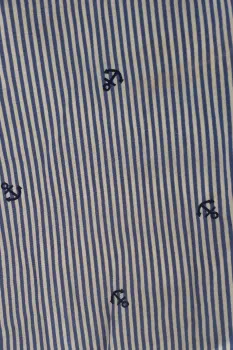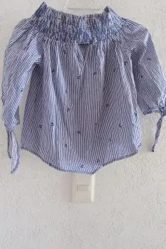 Blusa verano. Blusa con hombros descubiertos, manga 3/4 y en tonos lineales blanco con azul.