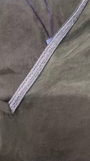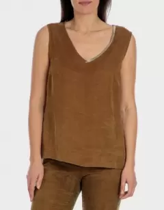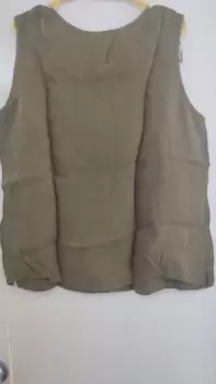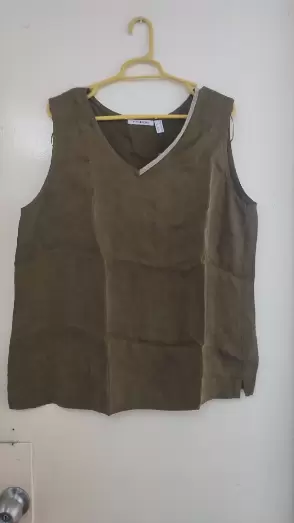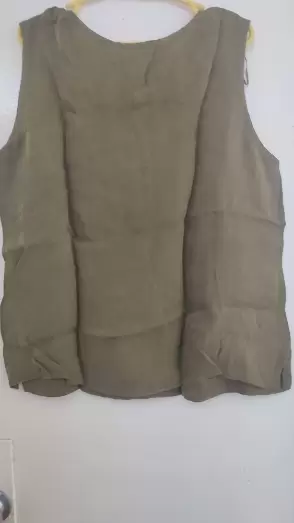 Blusa sin mangas, tela tacto piel de durazno.Mismo modelo de la última foto.Los brillos al filo del cuello son dorados. Y la tela un poco brillosa verde caqui