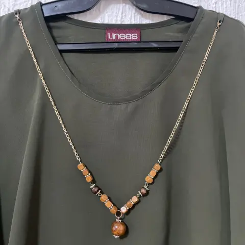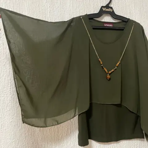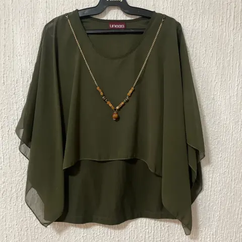 Blusa de dos partes: top tipo playera y tela superior ligera y vaporosa, como capa.Color verde espinaca.Incluye collar dorado con cuentas de madera, que se puede quitar para lavar o usar otro.Marca líneas.Talla grande.Cuello redondo.Poliéster.