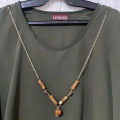 Blusa verde con collar. Blusa de dos partes: top tipo playera y tela superior ligera y vaporosa, como capa.Color verde espinaca.Incluye collar dorado con cuentas de madera, que se puede quitar para lavar o usar otro.Marca líneas.Talla grande.Cuello redondo.Poliéster.