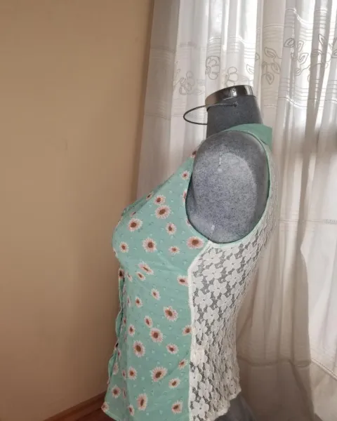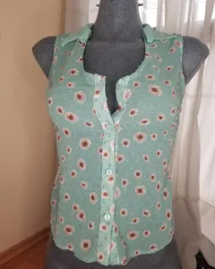 Blusa verde con estampado. Blusa botones en la parte de enfrente, encaje por la parte de atrasTalla SBlusa importada usada por horas.
