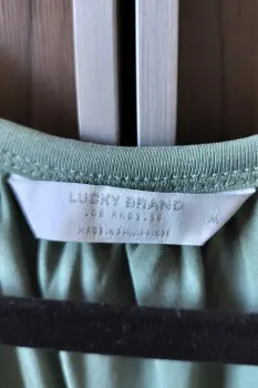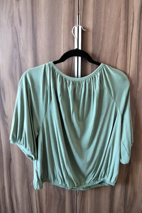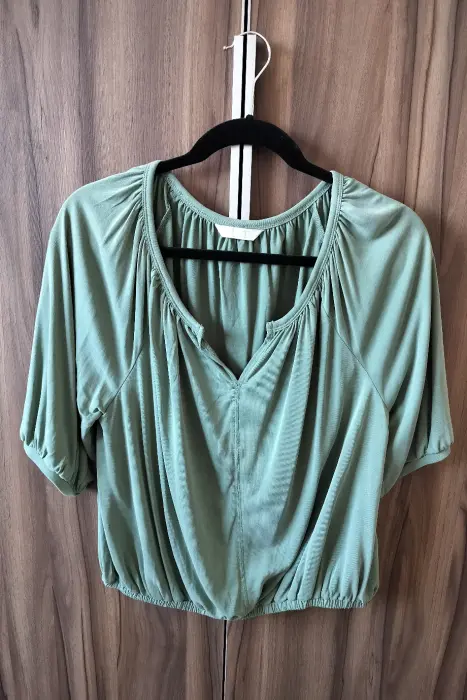 Blusa verde Lucky Brand. La manga llega por arriba del codo. La blusa es corta, llega a la cintura.