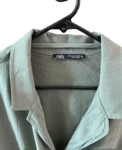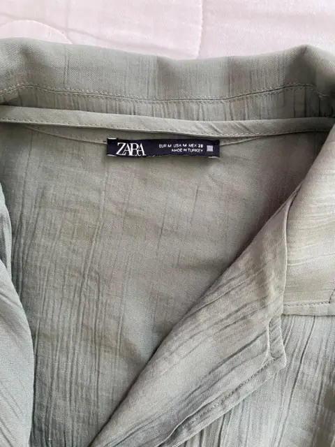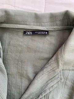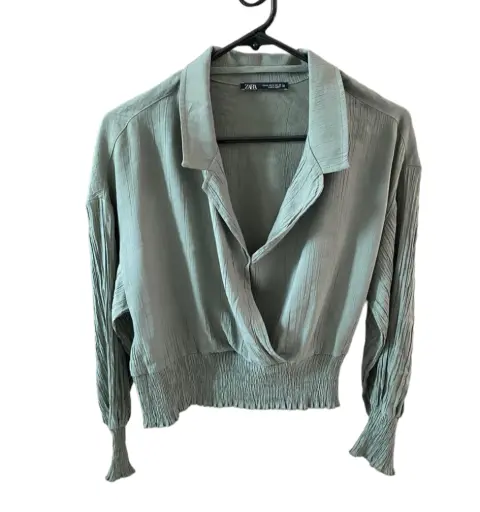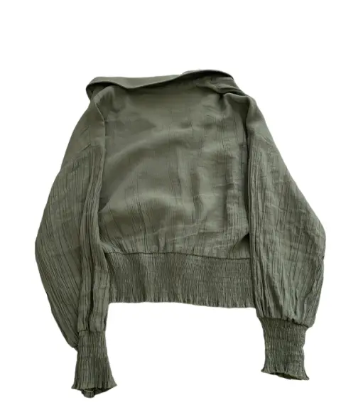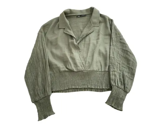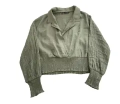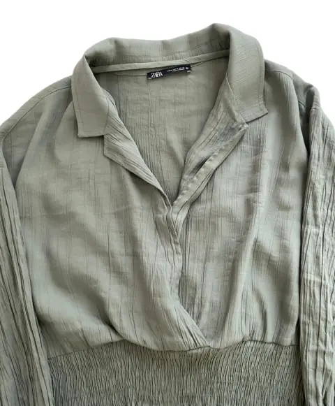 Blusa verde oliva, manga larga, tela fresca, cuello v, talla m pero le queda a una talla s (la talla viene reducida), plisada de la cintura.