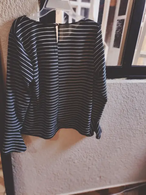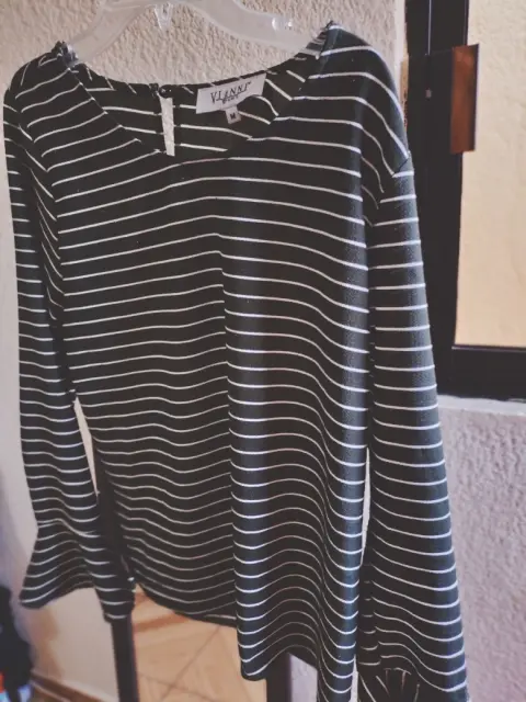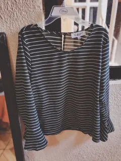 Blusa verde oscuro con mangas campana. Blusa verde oscuro con rayas blancas, de cuello redondo , se amolda a la figura de talla M